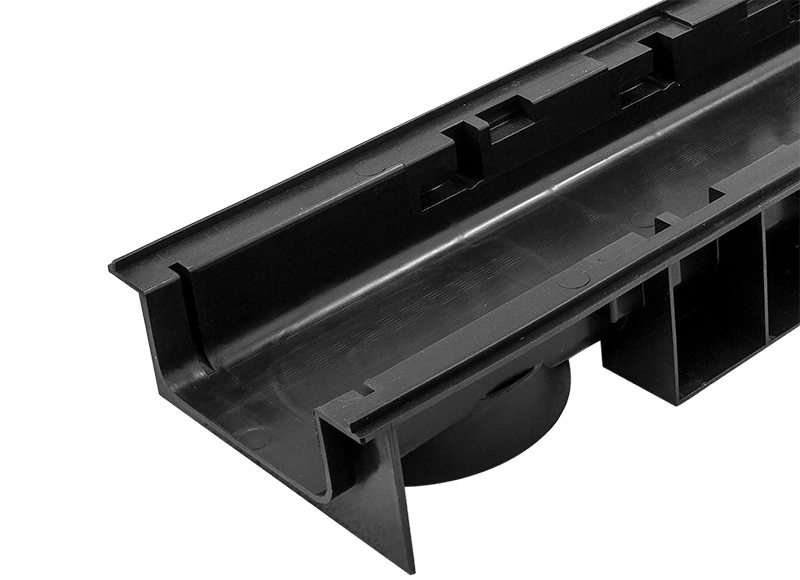 Канал пластиковый системы STANDART из вторичного ПЭ-ПП. Сформированное отверстие для подключения труб Ø 50 мм., Ø 110 для выпуска через дно лотка. Специальный паз для подключения других лотков под углом 90º и специальным пазом для распила лотка. Класс нагрузки А 15- С 250.