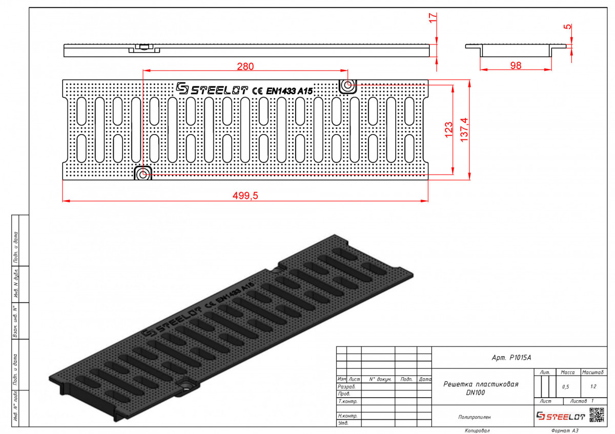 Решетка для лотка пластиковая SteeStart DN100 А15 черная (499*137*17) STEELOT