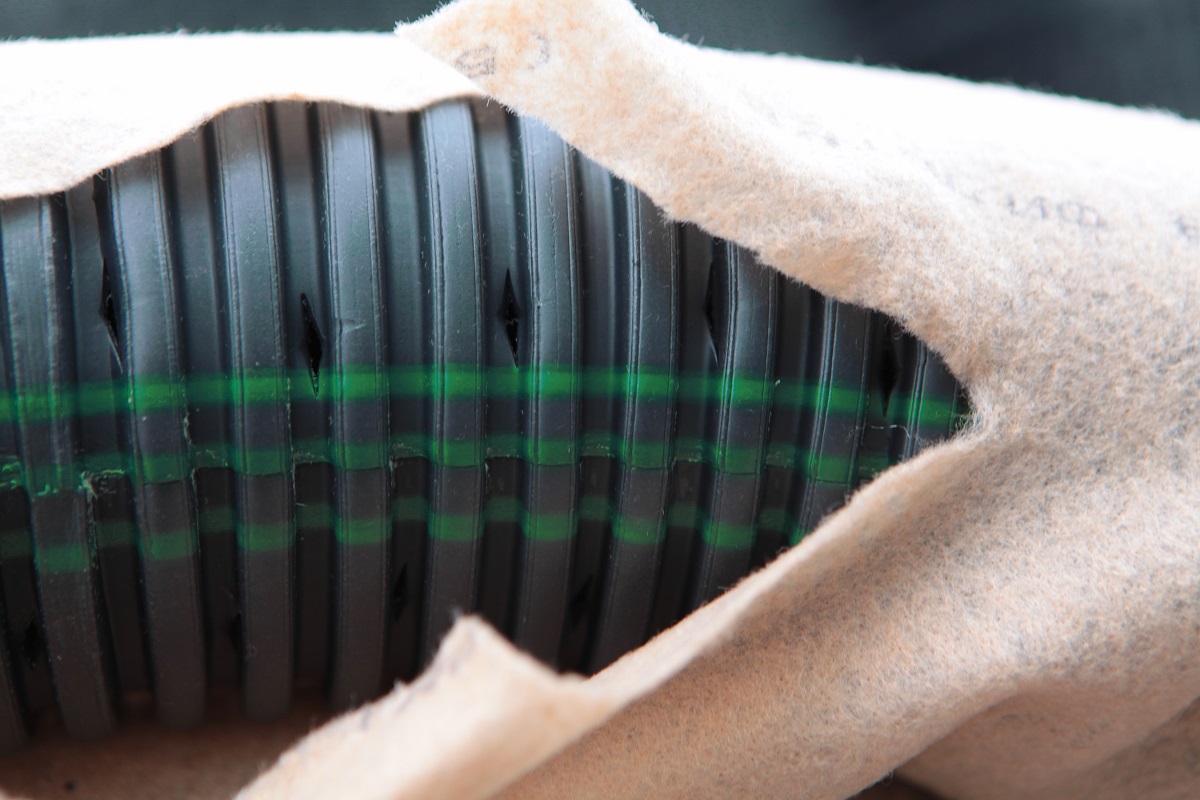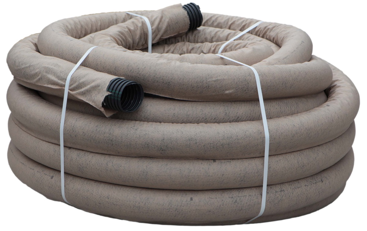 Бежевый фильтр на дренажной трубе быстро пропускает значительный объем воды. Отфильтровывает загрязения, частицы грунта и щебня, сохраняет систему работоспособной на долгие годы. Не затрудняет работу дренажа.