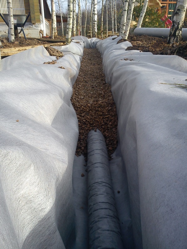Увеличенный рукав защитного фильтра на дренажной трубе позволяет укладывать дренаж без угловых соединений. Сгибаясь, труба натягивает фильтр. При обмотке фильтром "В притык" дренажная труба лишена гибкости. Находясь в натянутом состоянии долгое время, шов на текстиле может повредиться.