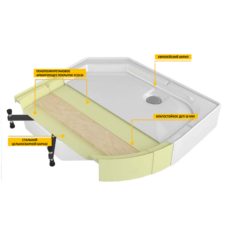 Для укрепления поддонов применяется современная технология – укрепление пенополиуретаном. ПЕНОПОЛИУРЕТАНОВОЕ АРМИРУЮЩЕЕ ПОКРЫТИЕ ECOLID® позволяет добиться высоких показателей прочности, отличных тепло- и звукоизоляционных свойств готовых изделий. Выдерживает нагрузку до 500 кг.