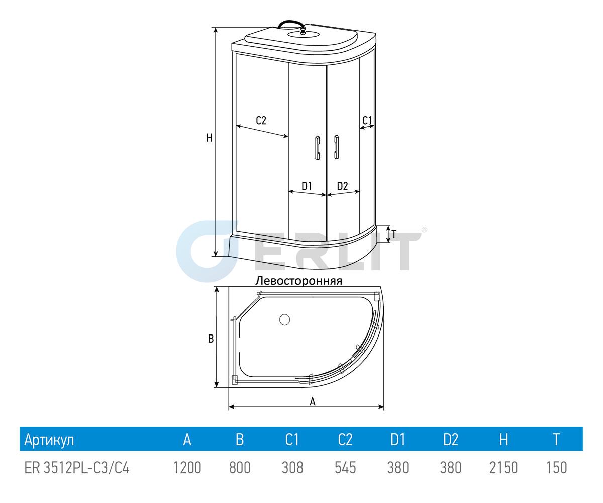 Душ кабина Erlit 120*80*215 арт.ER3512PL-C3 (L)матовое стекло низкий поддон тропич душ, ручной душ