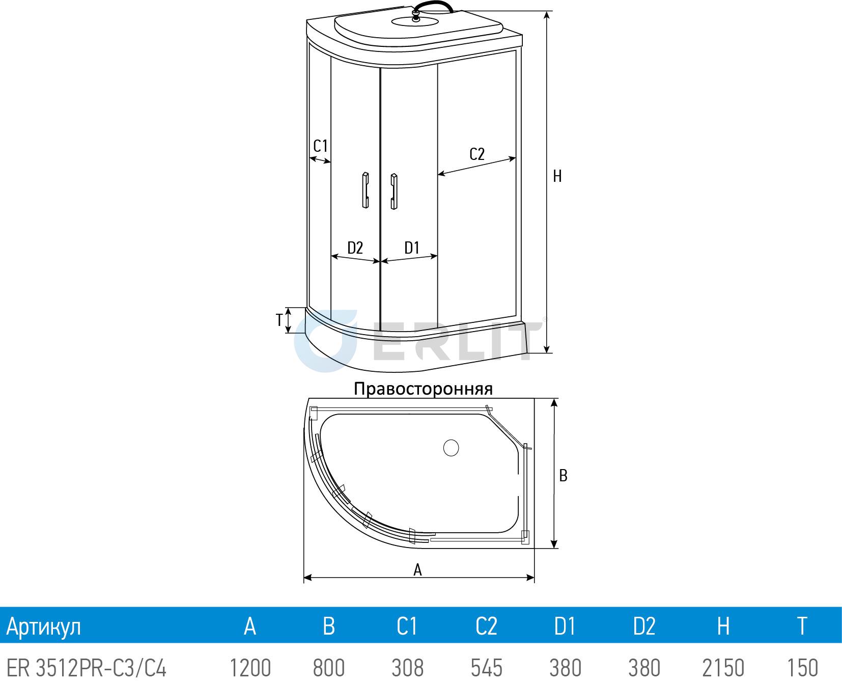 Душ кабина Erlit 120*80*215 арт.ER3512PR-C3 (R )матовое стекло низкий поддон тропич душ, ручной душ,
