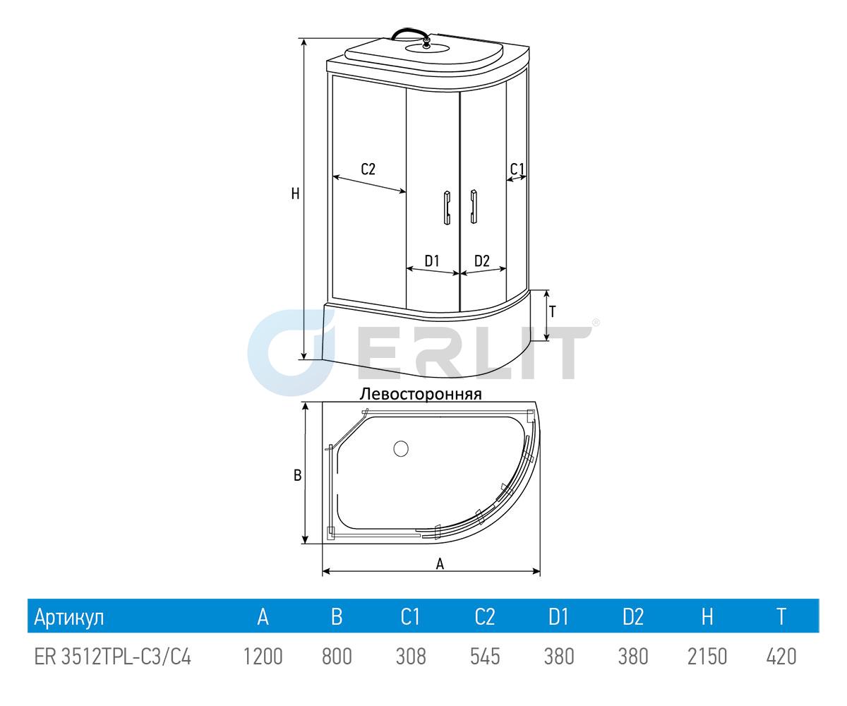 Душ кабина Erlit 120*80*215 арт ER3512TPL-C4 (L) тонир/стекло высок поддон тропич душ, ручной душ,