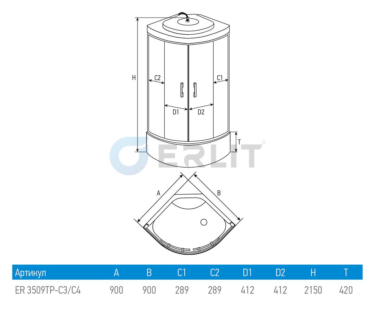 Душ кабина Erlit 90*90*215 арт.ER3509TP-C3 матов.стекло высокий поддон тропич душ, ручн. душ, АКЦИЯ