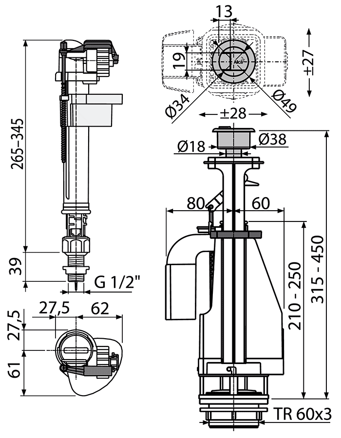 Конструкция позволяет регулировать высоту механизма в зависимости от высоты бачка