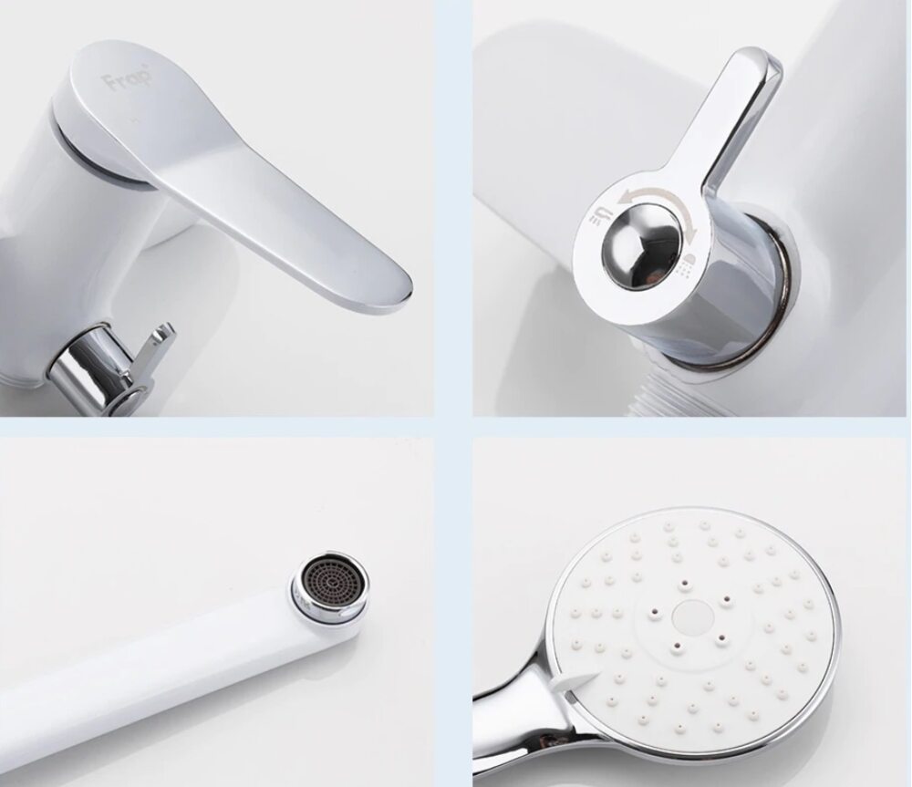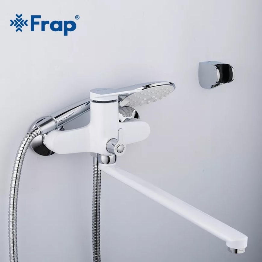 Frap смеситель для ванны, поворотный излив 35 см, однорычажный, керамический катридж 35 мм, переключатель в корпусе 180 градусов, комплектующие(душевой шланг 1,5 м, лейка, кронштейн для лейки, эксцентрики, прокладки, чашечки) цвет белый/хром, корпус латунный.