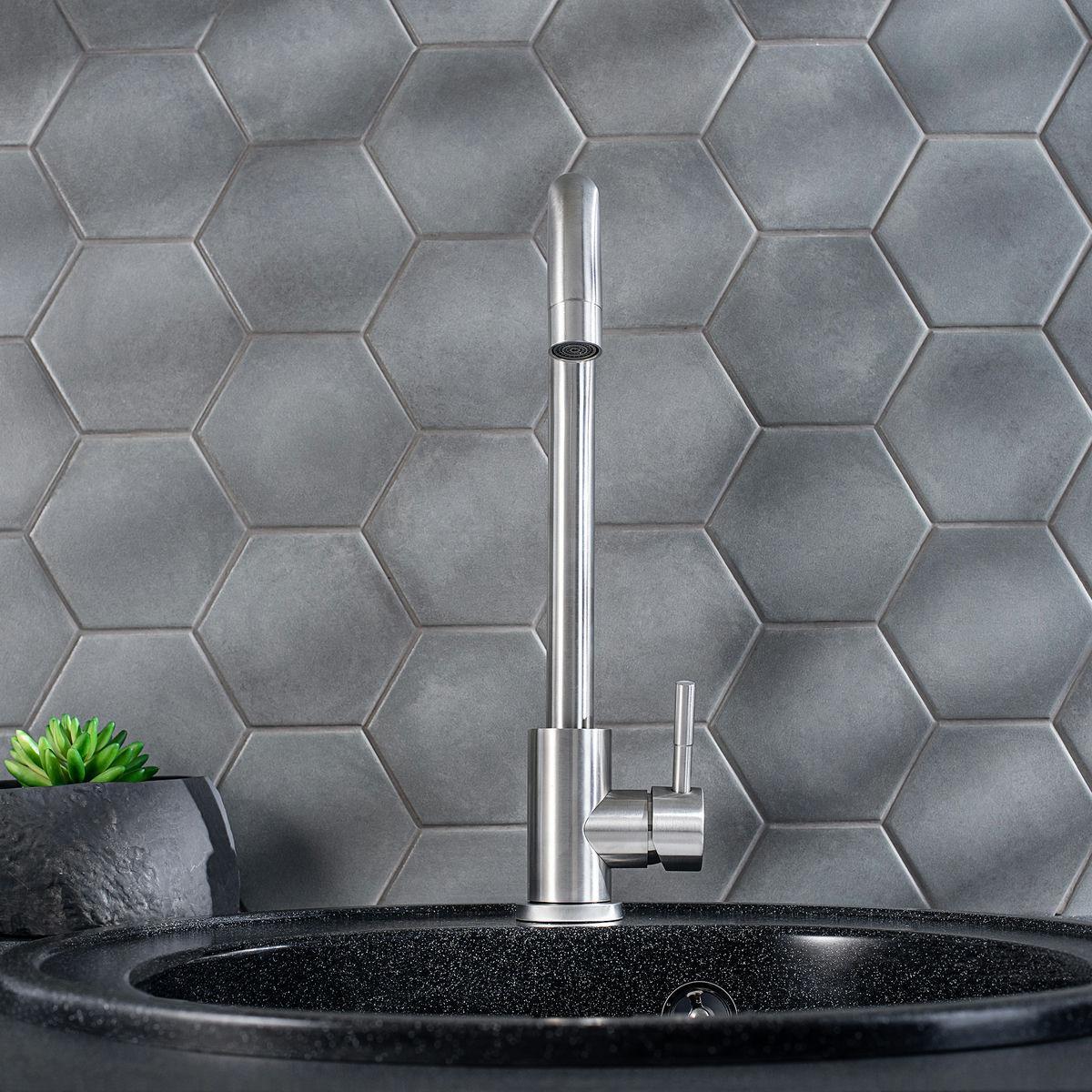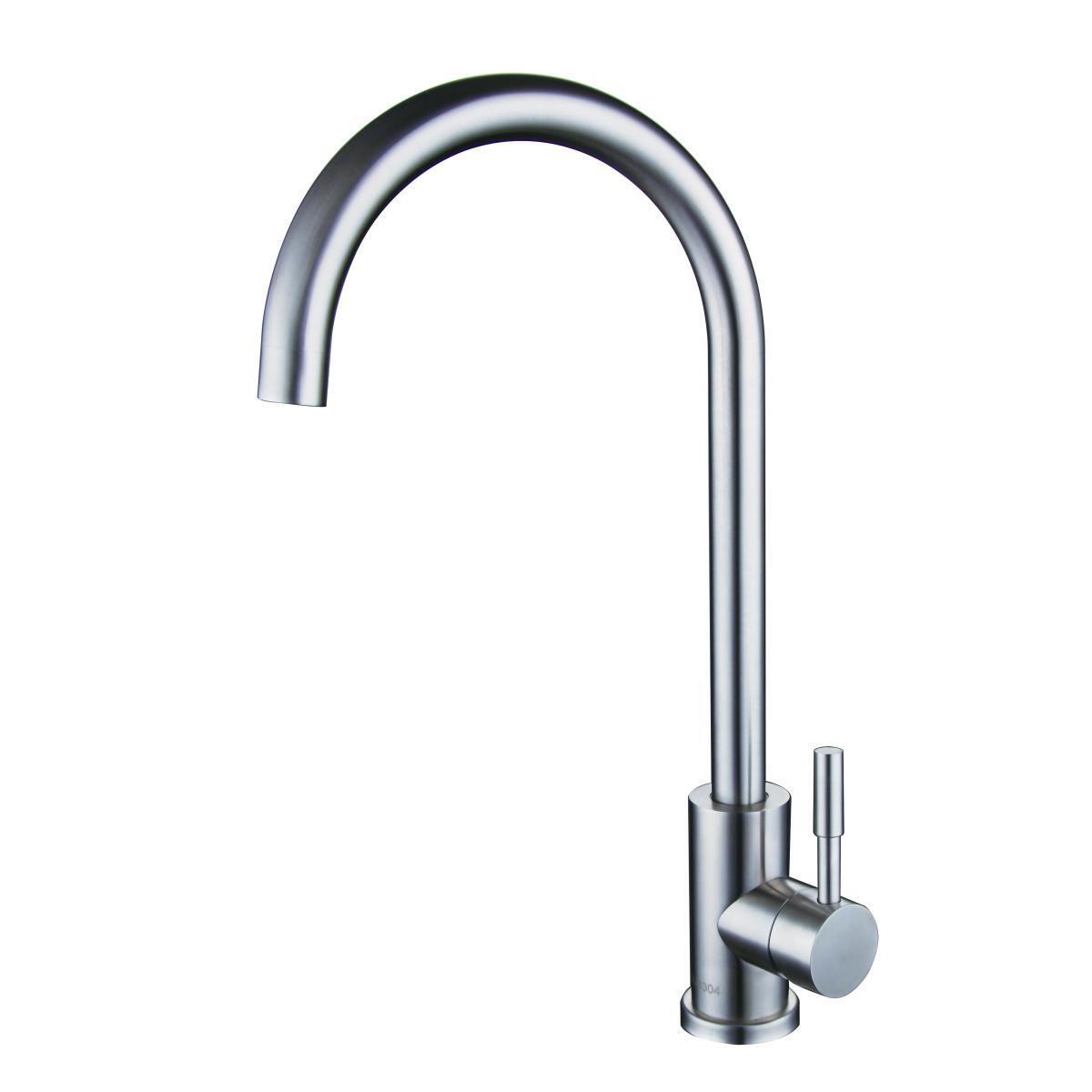 Стильный одноручковый смеситель для кухни из нержавеющей стали с высоким изливом прекрасно подойдет для мойки любого размера.