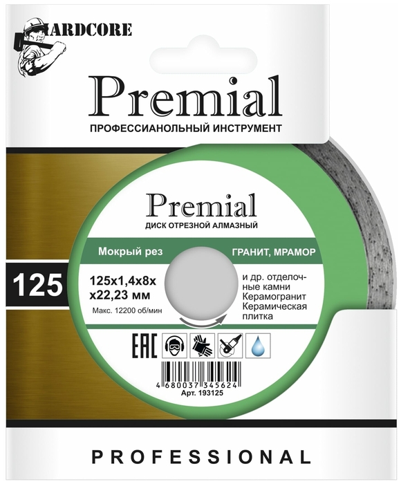 Диск алмазный ф180х25,4/22,23мм, влажный рез, сплошной, Гранит, "Hardcore", Premial, 193180