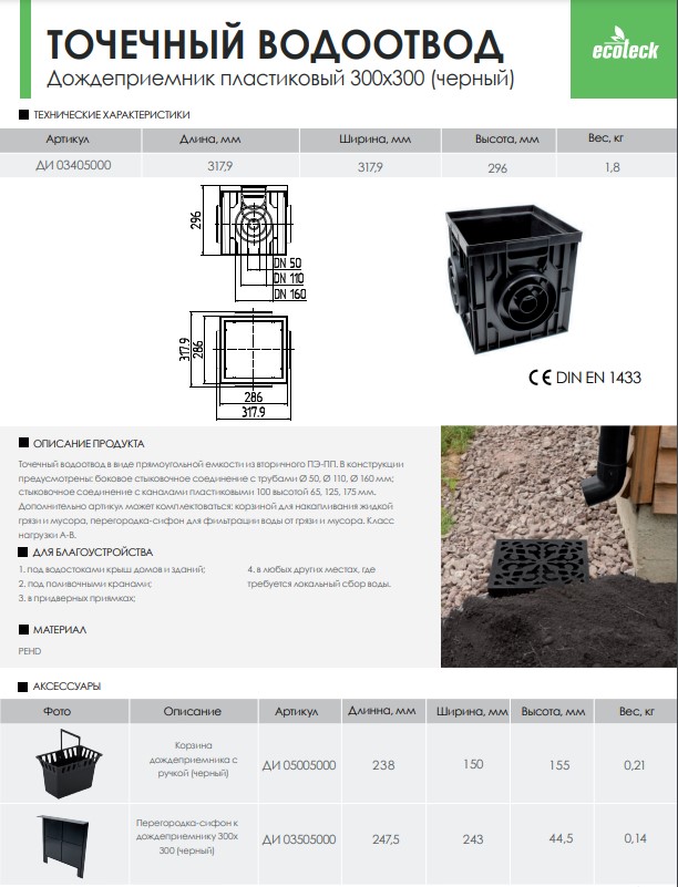 Сверху дождеприемники закрываются декорационными решетками, которые можно выбрать в зависимости от ранее просчитанной нагрузки на точечный отвод воды. Решетки для дождеприемников сохраняют систему водоотвода от проникновения в нее большого мусора. Ecoteck выпускает и предлагает несколько типов решеток к пластиковым дождеприемникам, рассчитанных на различные нагрузки. Пластиковые дождеприемники, также как и высококачественные решетки, послужат немало. Дождеприемники для точечного отвода воды имеют гладкие стены, и это их свойство служит более результативному водоотводу – дождеприемник не обрастает тиной и не засоряется. Чтобы очистить такой дождеприемник, не нужны таланты. Все работы сможет выполнить один человек за достаточно короткое время.