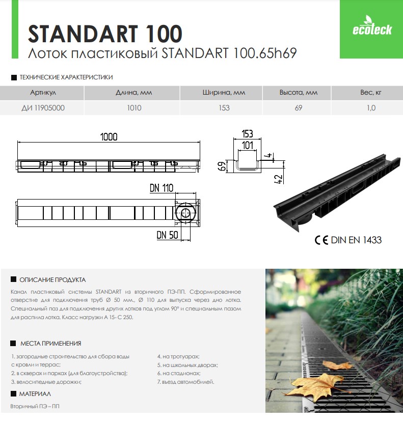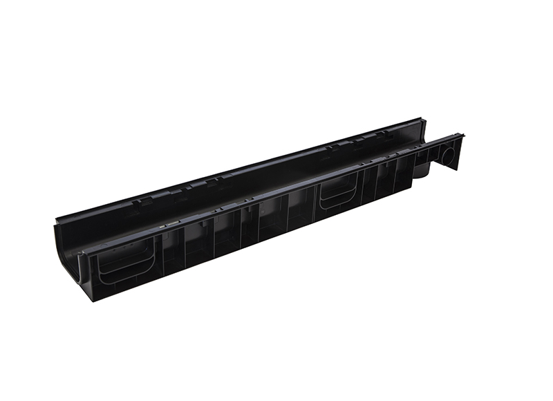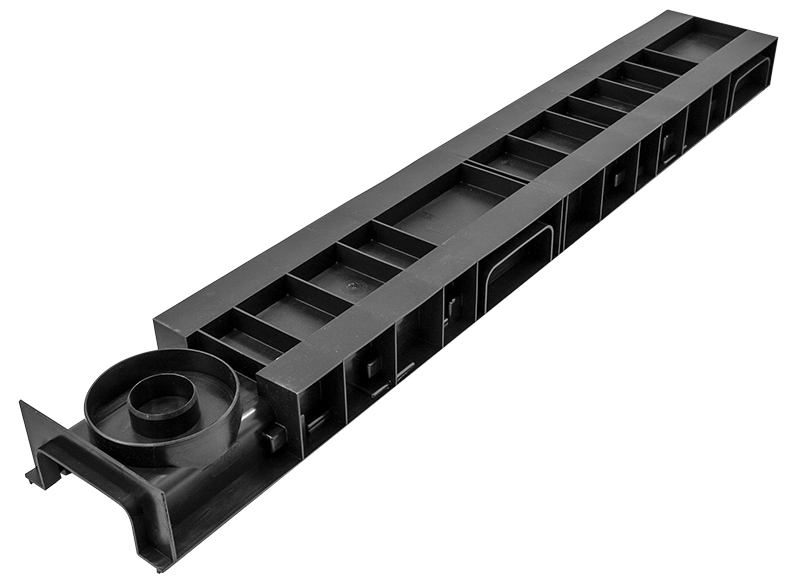 Канал пластиковый системы STANDART из вторичного ПЭ-ПП. Сформированное отверстие для подключения труб Ø 50 мм., Ø 110 для выпуска через дно лотка. Специальный паз для подключения других лотков под углом 90º и специальным пазом для распила лотка. Класс нагрузки А 15- С 250.