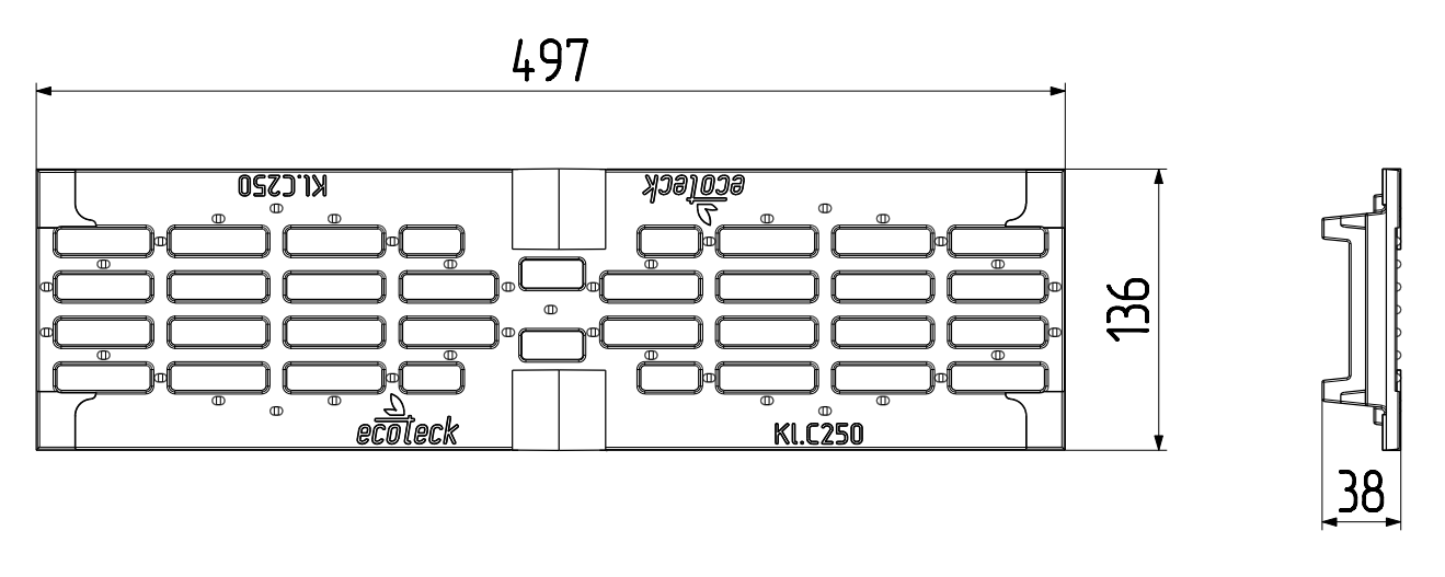 Дождеприемная решетка для водоотвода произведена из чугуна с использованием метода литья под давлением. Решетка имеет длину 0,5 м, ширину 0,136 м, высоту 0,038 м весит 3,4 килограмма. Класс нагрузки - A-C.
