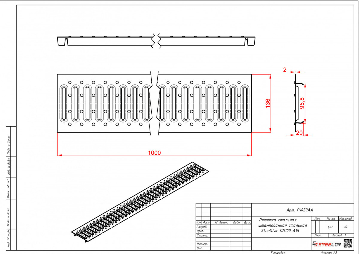 Решетка для лотка стальная штампованная SteeStart DN100 A15 (1000*135*20) STEELOT