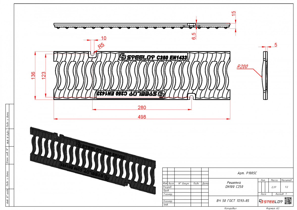 Решетка для лотка чугунная волна SteeStart DN100 C250 (498*136*15) STEELOT