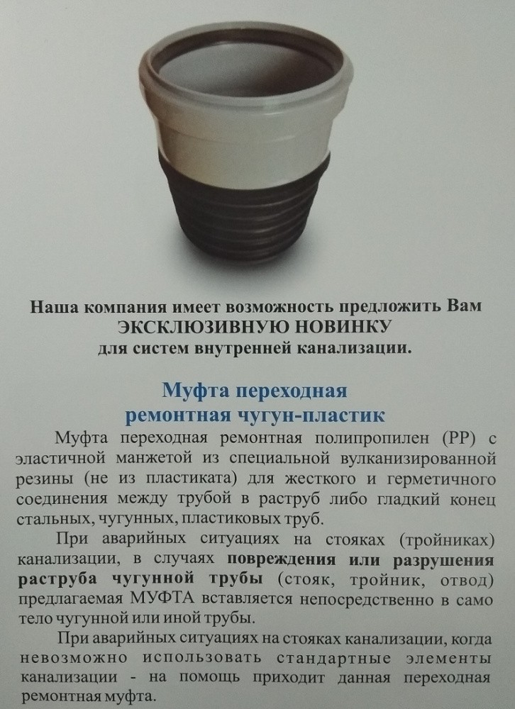 При аварийных ситуациях на стояках канализации, когда невозможно использовать стандартные элементы канализации - на помощь приходит данная переходная ремонтная муфта.