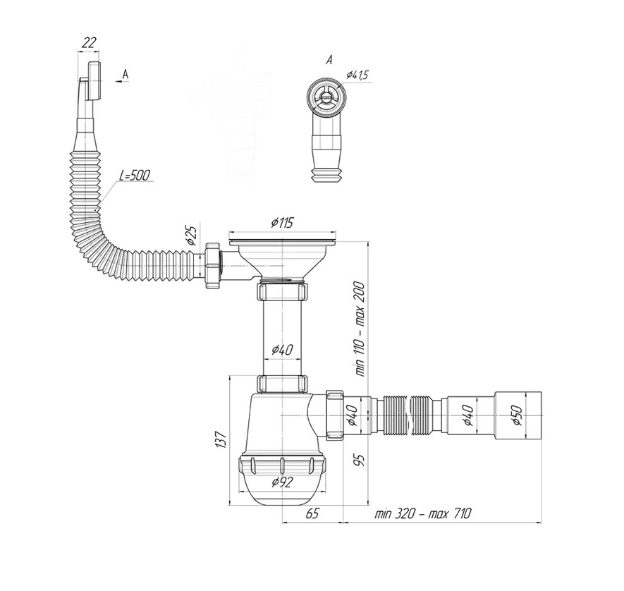 Сифон АНИ Грот 3 1/2*40 для мойки с гибким круглым переливом предназначен для организации водоотведения от кухонных моек из композитных материалов с диаметром сливного отверстия 90 мм. Перелив крепиться к переливному отверстию чаши и предотвращает переполнение мойки водой.