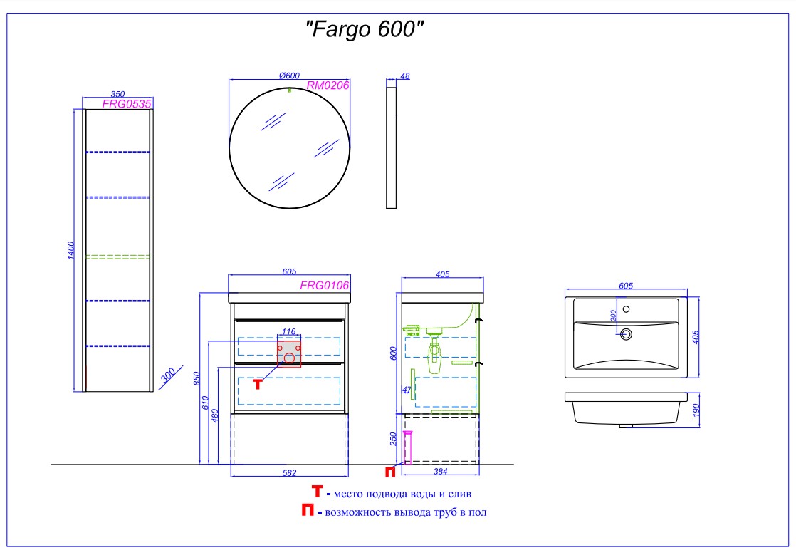 Фасады и корпус выполнены из ЛДСП (древесностружечной плиты повышенной плотности) в цвете дуб балтийский, кромка матового черного цвета. Тумбы Fargo в четырёх размерах 60, 70, 80 и 100 см по ширине комплектуются керамическими умывальниками серии Фостер производства российского завода Kirovit. Тумбы поставляются в подвесном исполнении с двумя ящиками, однако при монтаже гарнитур можно сделать напольным. Для этого необходимо добавить в набор ножки необходимого размера. Ножки металлические и окрашены в черный цвет. Алюминиевые ручки на тумбах также окрашены в черный цвет. Разместить ручки можно справа, слева или по центру фасада. Ящики тумб