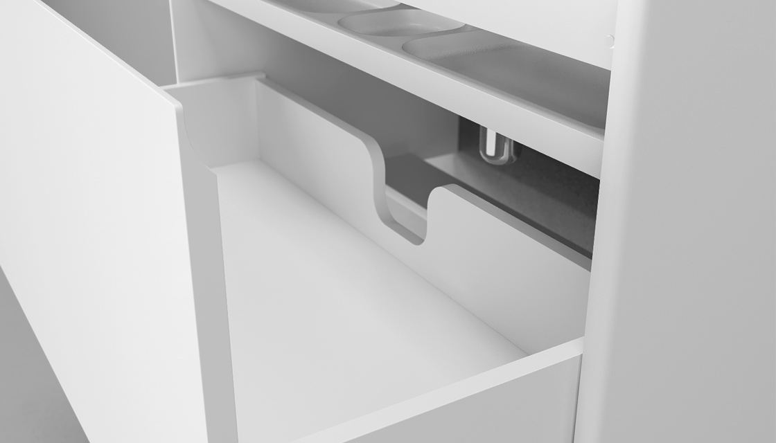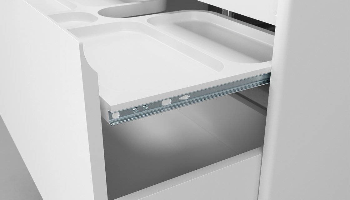 Отсутствие лицевой фурнитуры сохраняет утонченный дизайн коллекции и гарантирует безопасность использования, благодаря ровной поверхности фасадов тумб.