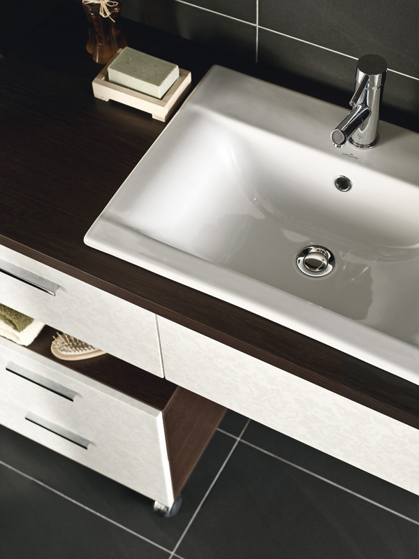 Тонкая раковина Ontario с отверстием под смеситель. Может устанавливаться на тумбу и на столешницу.
