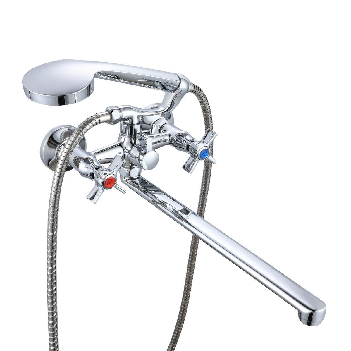 Настенный двуручковый смеситель для ванны с длинным поворотным изливом — стильное дизайнерское решение, которое органично сочетает функциональность и эстетичный внешний вид.