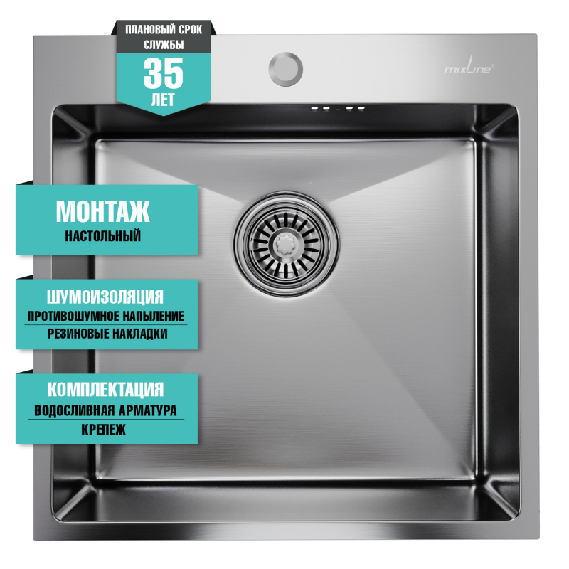 Мойка настол.монтаж 50*50 (3,0) вып 3 1/2 MIXLINE PRO 20 см с сифоном (сатин)